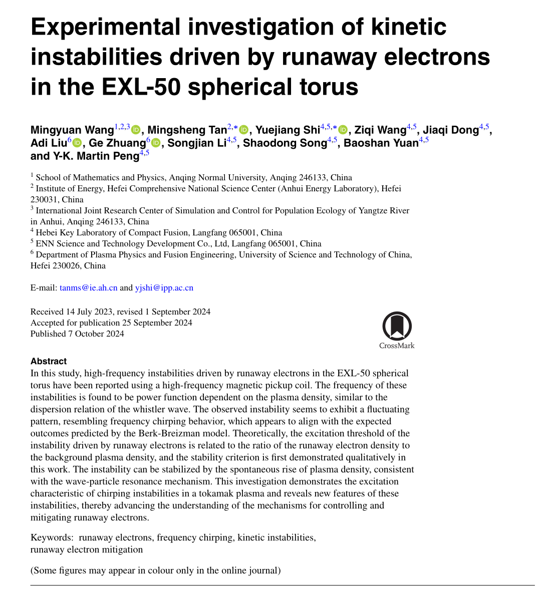 近日,数理学院与合肥综合性国家科学中心能源研究院及新奥科技发展有限公司的玄龙-50团队合作,在逃逸电子驱动不稳定性的实验研究中取得了重要进展。研究成果以“Experimental investigation of kinetic instabilities driven by runaway electrons in the EXL-50 spherical torus”为题,数理学院王明远博士作为第一作者发表于核聚变领域的知名期刊《Nuclear Fusion》,该期刊为中科院一区Top期刊,影响因子为 3.5。