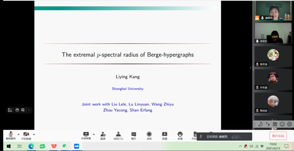 6月15日晚上,上海大学数学系康丽英教授应数理学院邀请作了一场题为“The extremalp-spectral radius of Berge-hypergraphs”的线上学术报告。数理学院兼职教授余桂东、数学一级学科硕士点部分导师和研究生同学参加了本次报告会,报告会由余桂东教授主持。
