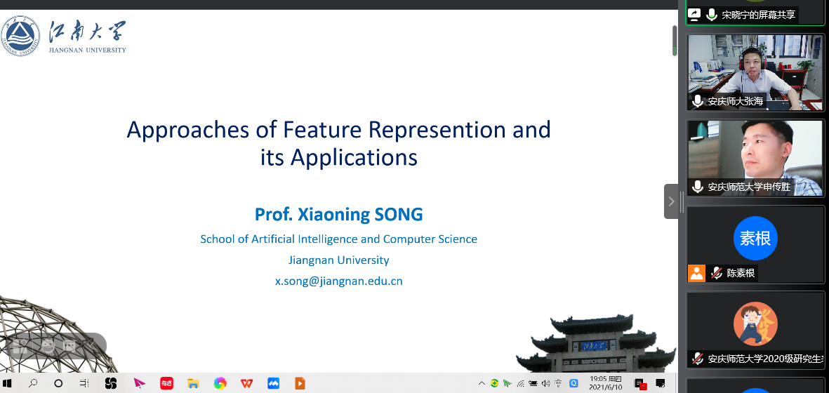 6月10日晚上,江南大学人工智能与计算机学院宋晓宁教授应数理学院邀请作了一场题为“Approaches of feature represention and its applications”的线上学术报告。数理学院经理申传胜教授、副经理张海教授、数学一级学科硕士点和统计学一级学科硕士点导师和研究生同学参加了本次报告会,报告会由张海教授主持。