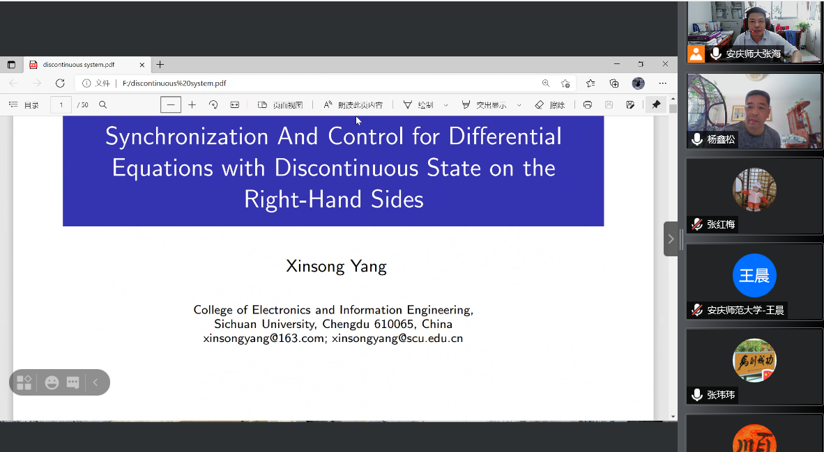 6月17日下午,四川大学博士生导师杨鑫松教授应数理学院邀请作了一场题为“Synchronization and Control for Differential Equations with Discontinuous State on the Right-hand Sides”的线上学术报告。数理学院副经理张海教授、数学一级学科硕士点导师和研究生同学参加了本次报告会,报告会由张海教授主持。