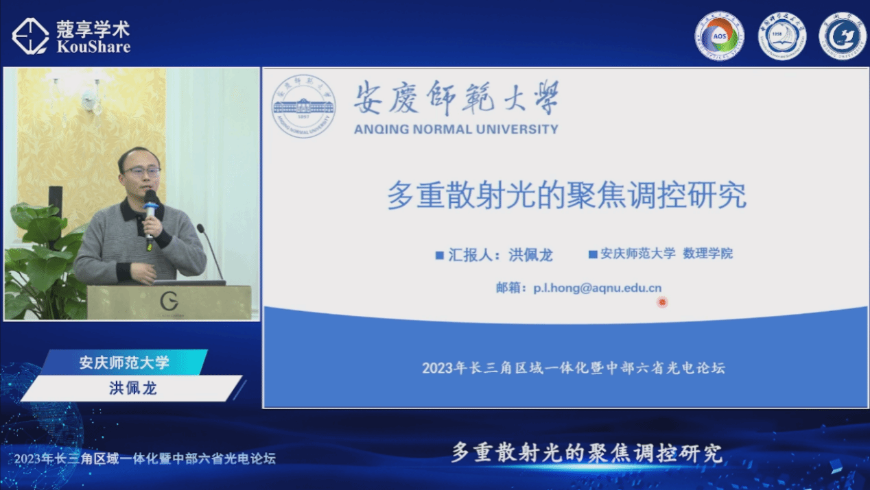 数理学院洪佩龙副教授参加了本次光电论坛,并作了题为“多重散射光的聚焦调控研究”的学术报告。报告围绕复杂无序介质中多重散射光的调控,重点介绍了研究团队在无序介质内局域能量增强的三维分布规律,以及抗干扰/高对比度多点聚焦等方面的工作进展,学术报告得到了与会专家的关注。洪佩龙副教授聆听了与会专家学者的精彩报告,开拓了学术视野,并进行了学术交流。