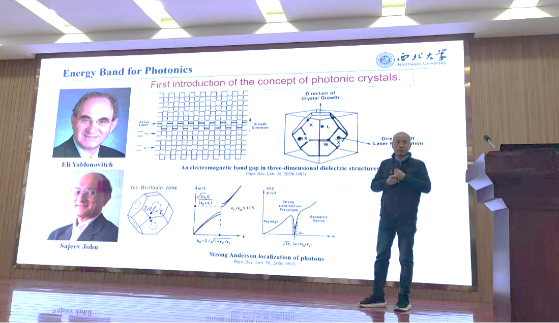 齐新元教授从光子晶体和能带调控理论出发,介绍了准二维光子晶格中能带耦合理论和光场输运调控的最新发展成果,包括拓扑相位、陈数、光局域和群速度调控等。最后,齐新元教授介绍了西北大学物理专业的发展历程,分享了物理专业的建设经验、研究生招生和培养情况。