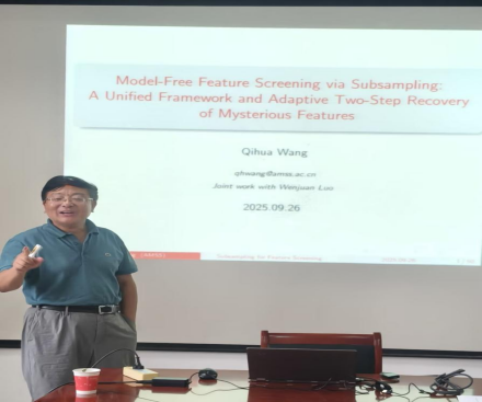 9月26日,中国科学院系统科学与数学研究院博士生导师王启华研究员应数理学院邀请,作了一场题为“Model-Free Feature Screening via Subsampling: A Unified Framework and Adaptive Two-Step Recovery of Mysterious Features”的学术报告。报告会由数理学院统计系胡学平教授主持,统计系教师、研究生及部分本科生参加了报告会。