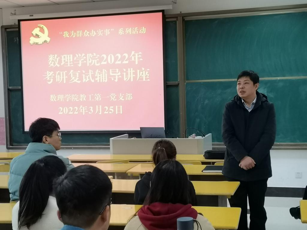 活动中,数学系主任赵正俊教授就研究生复试相关政策、复试项目、成绩构成及基本流程进行了详细讲解,对复试中各环节的细节要求进行了剖析,指导同学们力争在复试中正常发挥自己的专业学术水平。赵教授还就关于硕士研究生调剂录取相关政策和注意事项进行了细致解读,在如何选择调剂学校和调剂专业上给同学们提出了中肯建议。