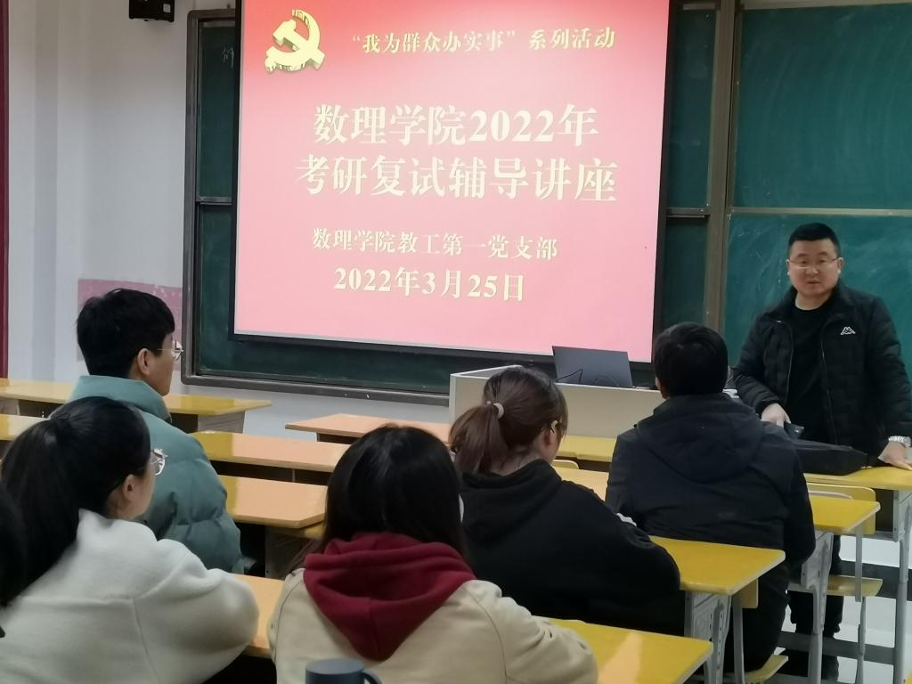 为推动党史学习教育“我为群众办实事”实践活动走深走实,增强考研员工信心,提升复试效果,3月25日下午两点由教工第一党支部组织开展“考研复试辅导讲座”,讲座由教工一支部支部书记陈文兵主持,支部骨干教师参加了活动。