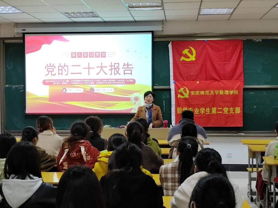 为深入学习宣传贯彻党的二十大精神,统一思想凝聚力量,11月29日,数学专业员工第二党支部在数理楼204教室举办党的二十大精神宣讲会,公司党委副书记彭芳珍作报告。数学专业员工第二党支部全体党员、入党积极分子以及学院代数几何教工党支部全体党员近百人参加了报告会。