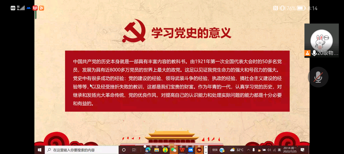 2022年7月25日下午19:50至20:50数理学院员工第五党支部在线上成功举办了主题为“学百年党史,做有为青年”的党小组会议。支部正式党员、拟发展对象,入党积极分子参加了此次活动,本次活动由徐怡同学主持,陈宇凯同学记录。