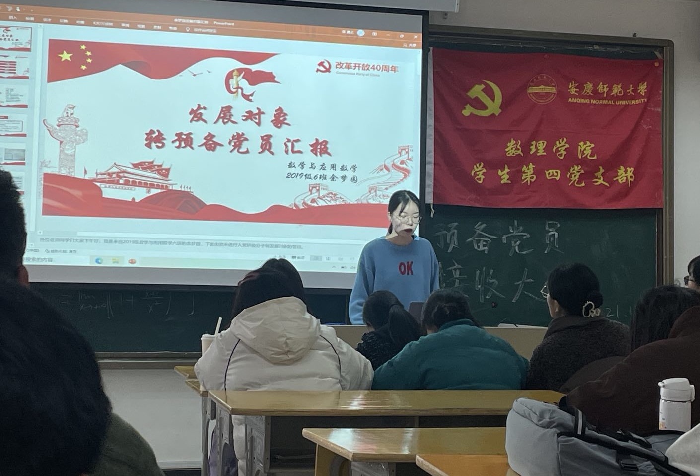 12月8日下午两点,数理学院员工第四党支部在数学楼201教室成功召开预备党员接收大会。本次预备党员接收大会由周天赋同志主持,支部书记潘美玲老师和支部正式党员、预备党员、发展对象参加了此次大会。