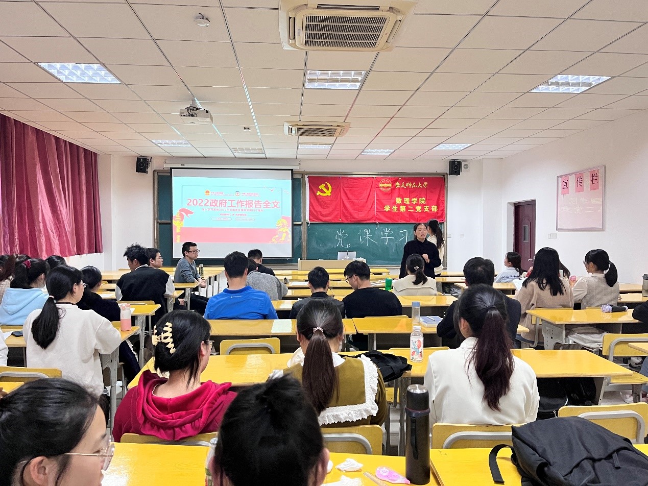 活动伊始,滕秀花老师向我们介绍了本次活动开展的目的和意义,随后进行了党课讲解,围绕“奋进新时代,筑梦新征程”的主题深入学习贯彻2022年全国两会精神。滕秀花老师从全国人大十三届五次会议基本概况,2021年政府工作回顾,2022年经济社会发展总体要求和政策取向,2022年政府工作任务和2022年对政府工作要求五个方面来学习两会的主要内容。