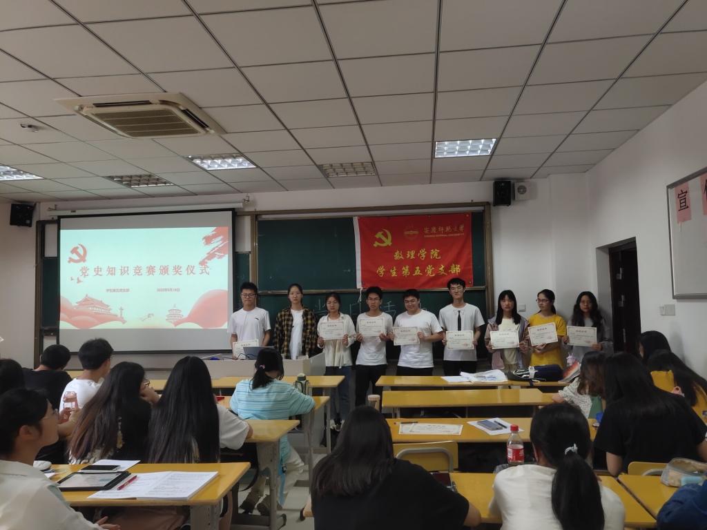 2022年5月18日,数理学院员工第五党支部在I502教室成功召开了党史知识竞赛颁奖仪式的党日活动。此次活动由唐啸主持,支部正式党员、预备党员、发展对象、入党积极分子参加了此次活动。