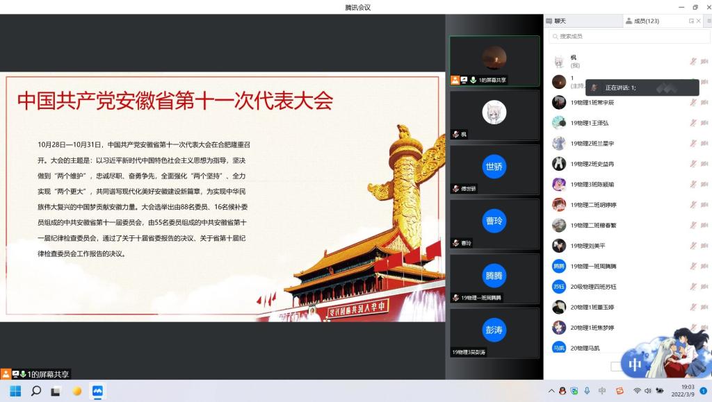 3月9日晚上七点,数理学院员工第五党支部的党员同志们在线上开展了党小组理论学习活动,共同学习安徽省第十一次党代会精神。支部正式党员、预备党员、发展对象参加了此次活动,活动由陈佳华同志主持。