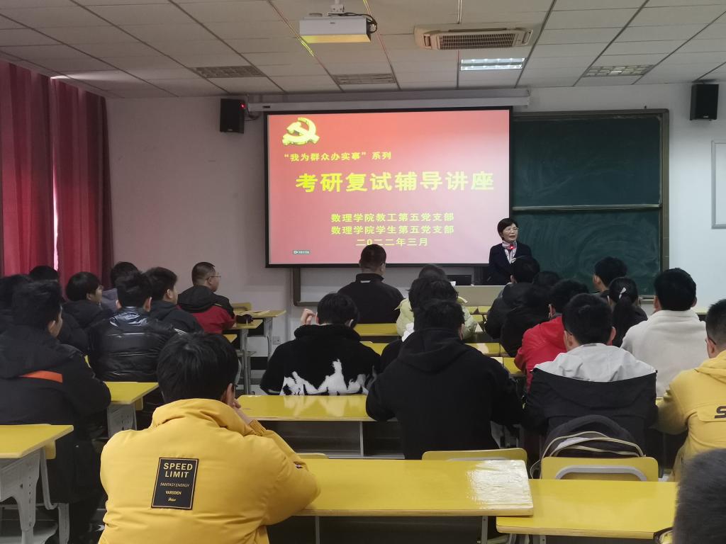 3月24日中午12点30分,数理学院教工第五党支部和数理学院员工第五党支部联合开展“我为群众办实事”系列活动,本次活动的主题为“考研复试辅导讲座”。教工支部的骨干老师,员工支部的全体党员和部分入党积极分子参加了活动,活动由教工第五党支部书记胡积宝老师主持。