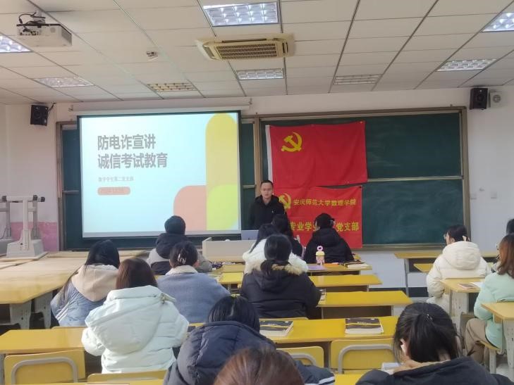 2024年12月25日,数学专业员工第二党支部在I602召开“防电诈宣讲及诚信考试教育”主题党日活动,支部全体员工党员和入党积极分子参加,会议由支部书记江凡老师主持。