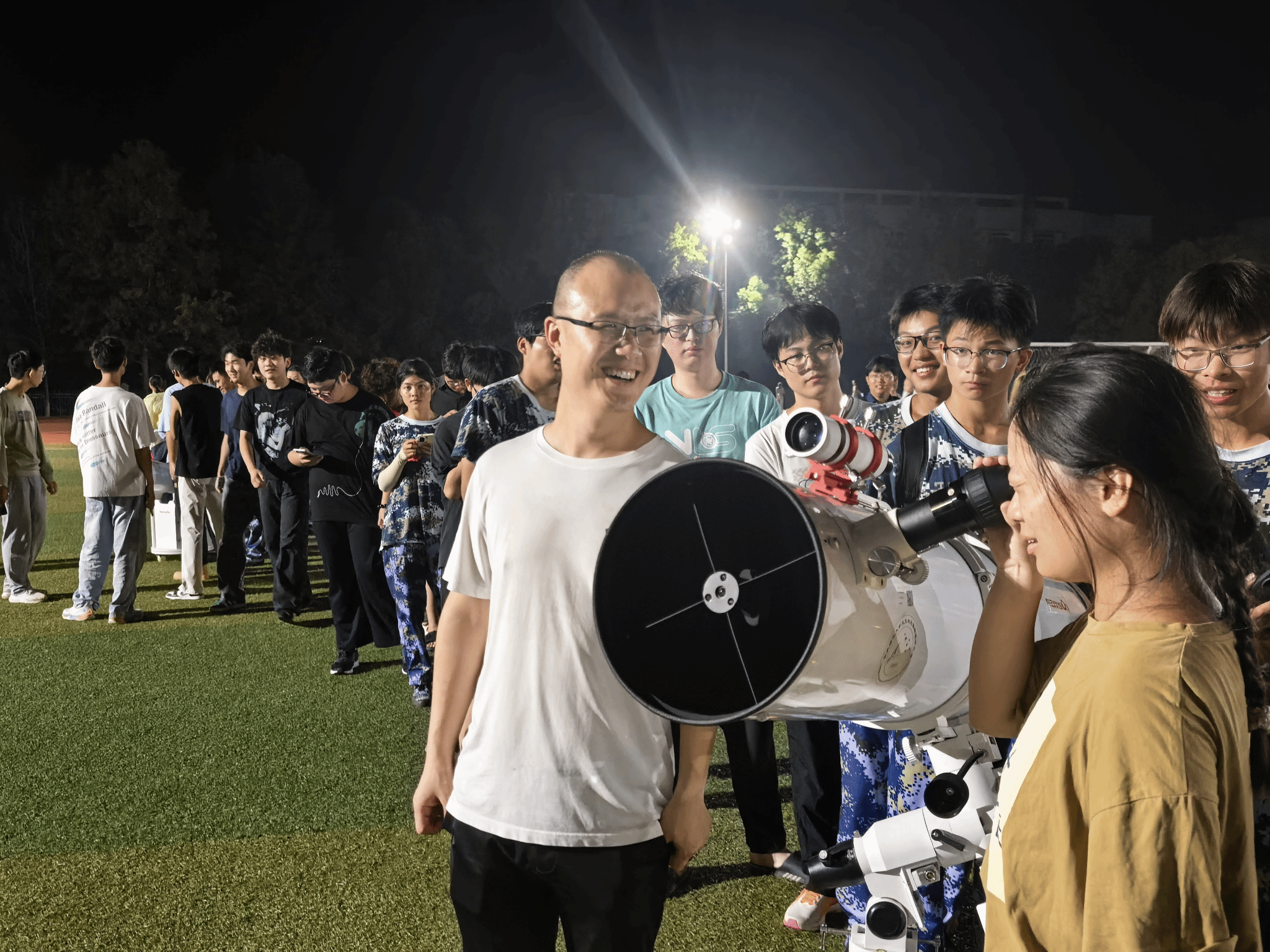 9月27日,中秋月近,国庆将至,安庆师范大学校园内洋溢着浓厚的节日氛围。数理学院物理学教师党支部联合老员工天文爱好者协会,成功举办以“迎中秋、庆国庆”为主题的“中秋之夜”全国科普月精品活动,并同步开展天文观测公益科普服务。活动吸引了约5000名师生热情参与,现场人潮涌动,星光与灯火交相辉映,共同绘就一幅青春与科学交融的动人画卷。