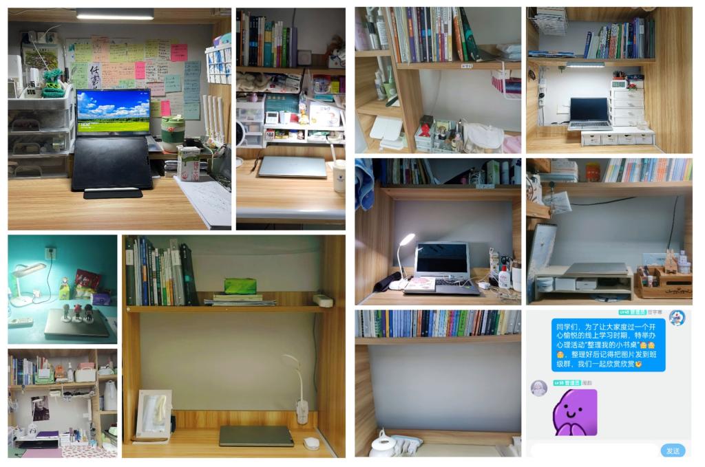 12月7日,2021级数学与应用数学“邓稼先班”举办“整理我的小书桌”心理健康活动。40名员工纷纷将整理好的书桌拍照上传班级群,大家分享交流、互相欣赏,鼓励彼此在学习生活中寻找乐趣。“希望通过此次活动,让大家在线上学习中调整状态,共同展现生活自律、积极向上的学习风貌,努力把心情调节到最接近快乐的状态。”活动负责员工豆宇寒说。