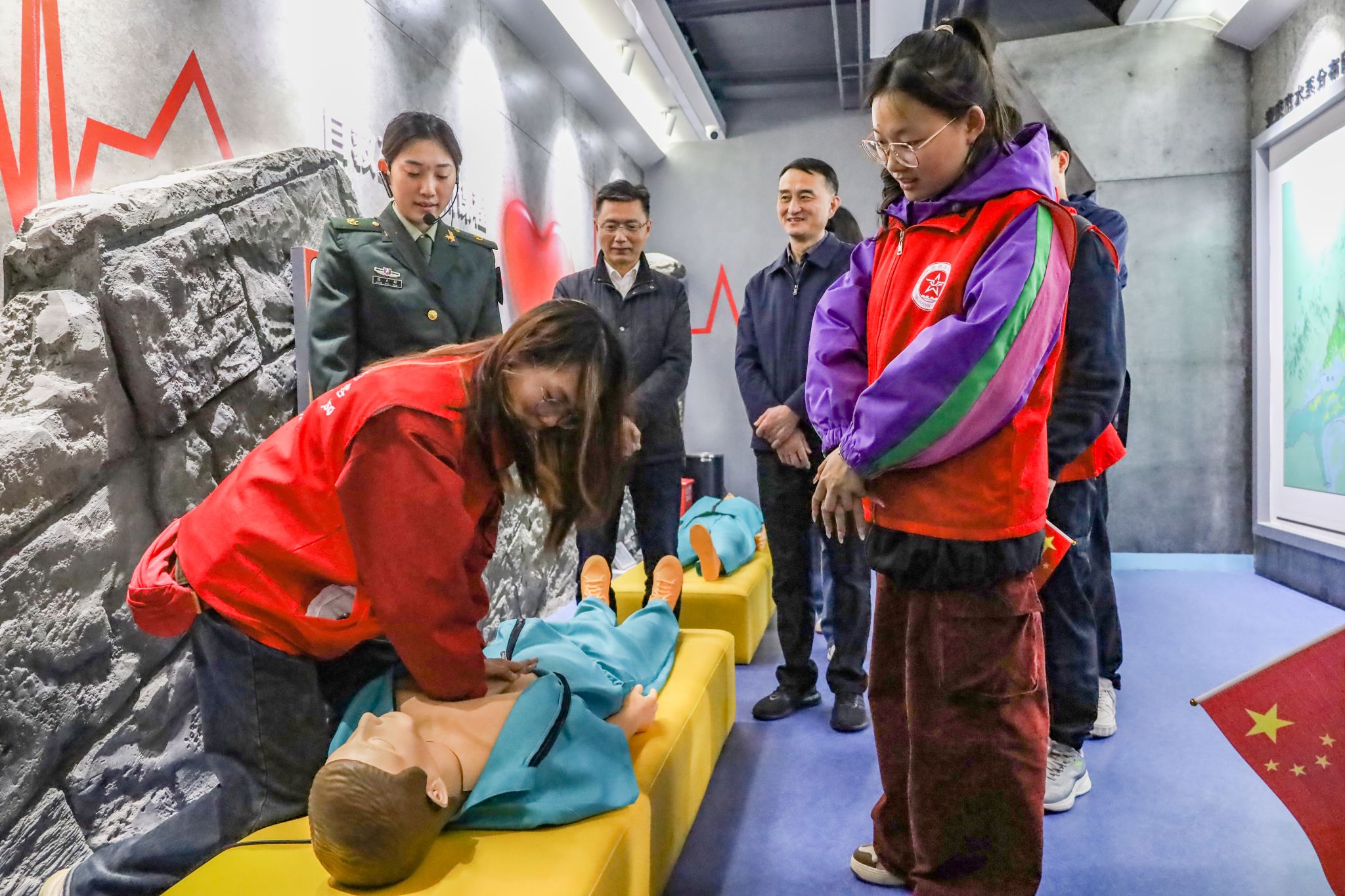 从世界防空发展史到人民防空建设,讲解员向教师和员工们详细介绍了国家的空袭事件、防空体系、防空武器和新三防等知识,并带领参观人员学习、体验防空警报鸣笛、动感战机VR、人防知识问答以及心肺复苏等项目。“这两种人防工程砖墙的区别在哪?”“心肺复苏前首先要进行什么?”“火灾现场如何逃离?”……在参观过程中,讲解员与员工们积极互动,使得员工们更加全面地了解国防人防。