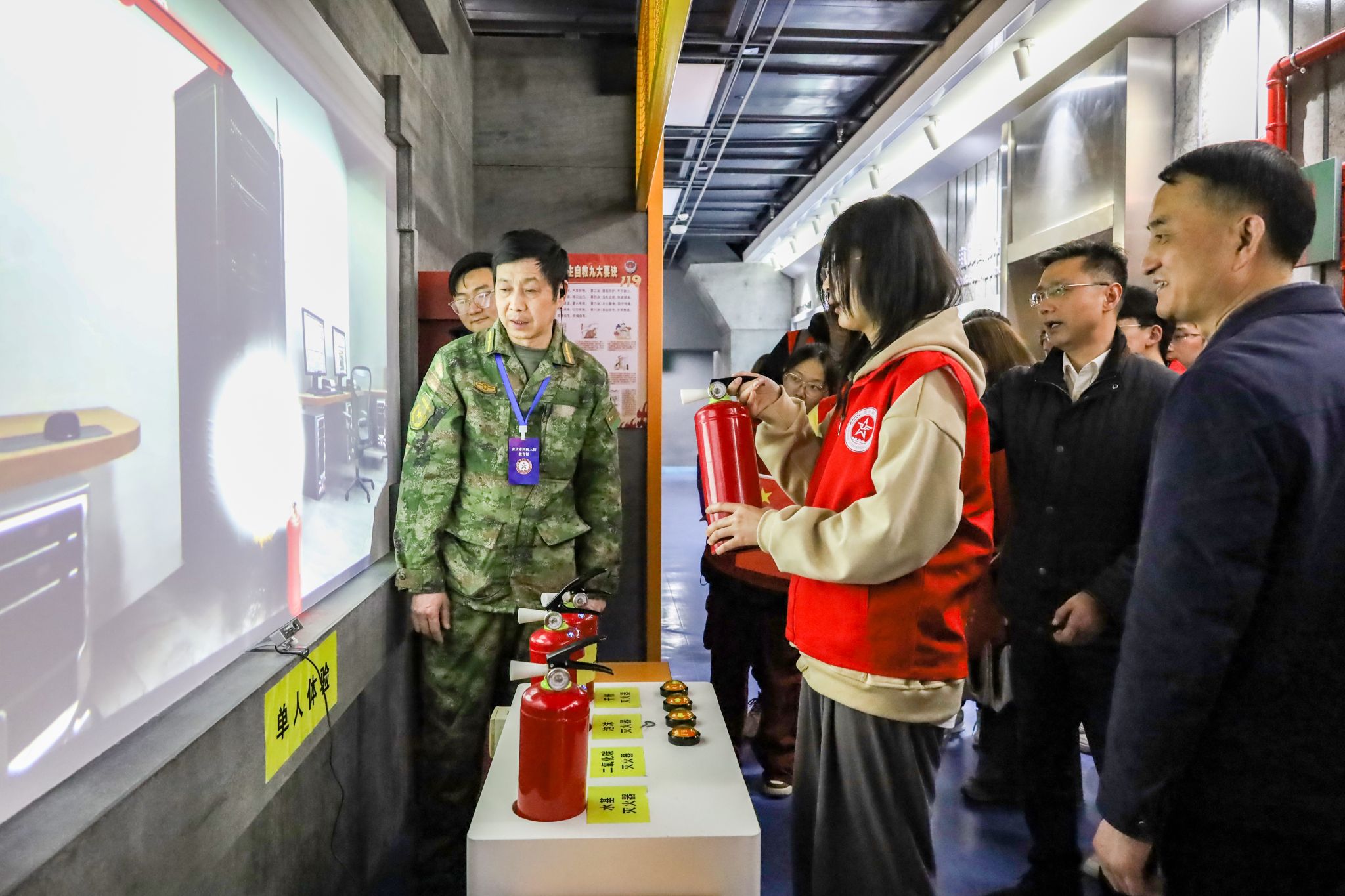 交流会后,志愿服务团的成员们手握小红旗,身穿红马甲,在讲解员的带领下,前往市国防人防教育馆,上了一堂体验感“拉满”的爱国主义教育“课”。多样的武器模型、精彩的科普视频、有趣的互动游戏……教育馆内,员工们通过“沉浸式”参观体验,逐步了解防空防灾知识和自救互救技能。