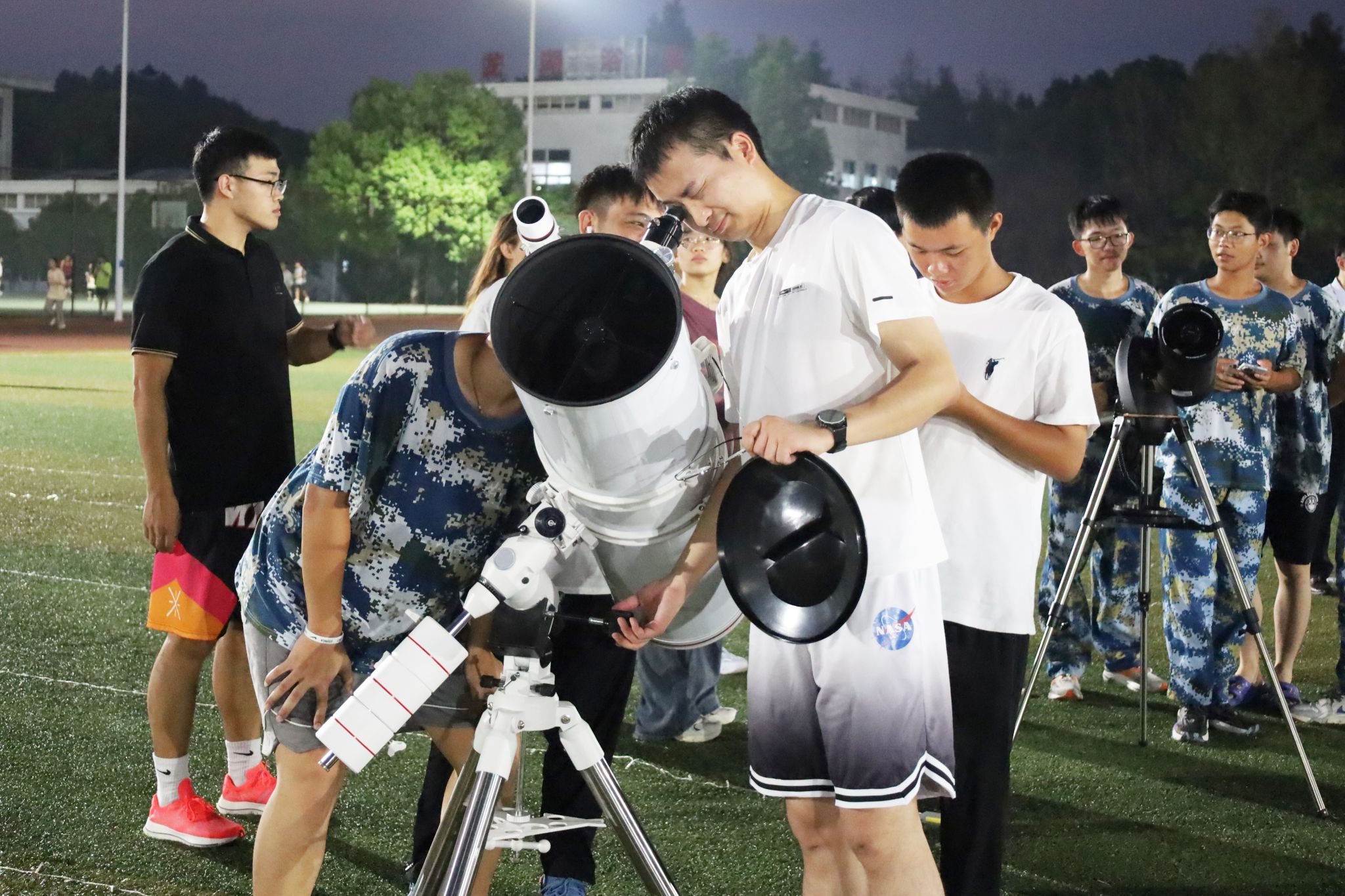 “月球表面凹凸不平,上面竟然什么也没有。”数学类2024(4)班的彭欣在协会指导教师徐骏的指导下成功观月后感叹,她身着军训服,在一次观测后依旧跃跃欲试,对天文感兴趣的她认识书中的众多星座但鲜少尝试。同时,她在模型展览处积极与协会成员交流,“赤道仪反射望远镜,磁悬浮地球仪,辉光球,老师和学长们给我科普了许多天文和物理知识,这是一个特别的中秋活动!”