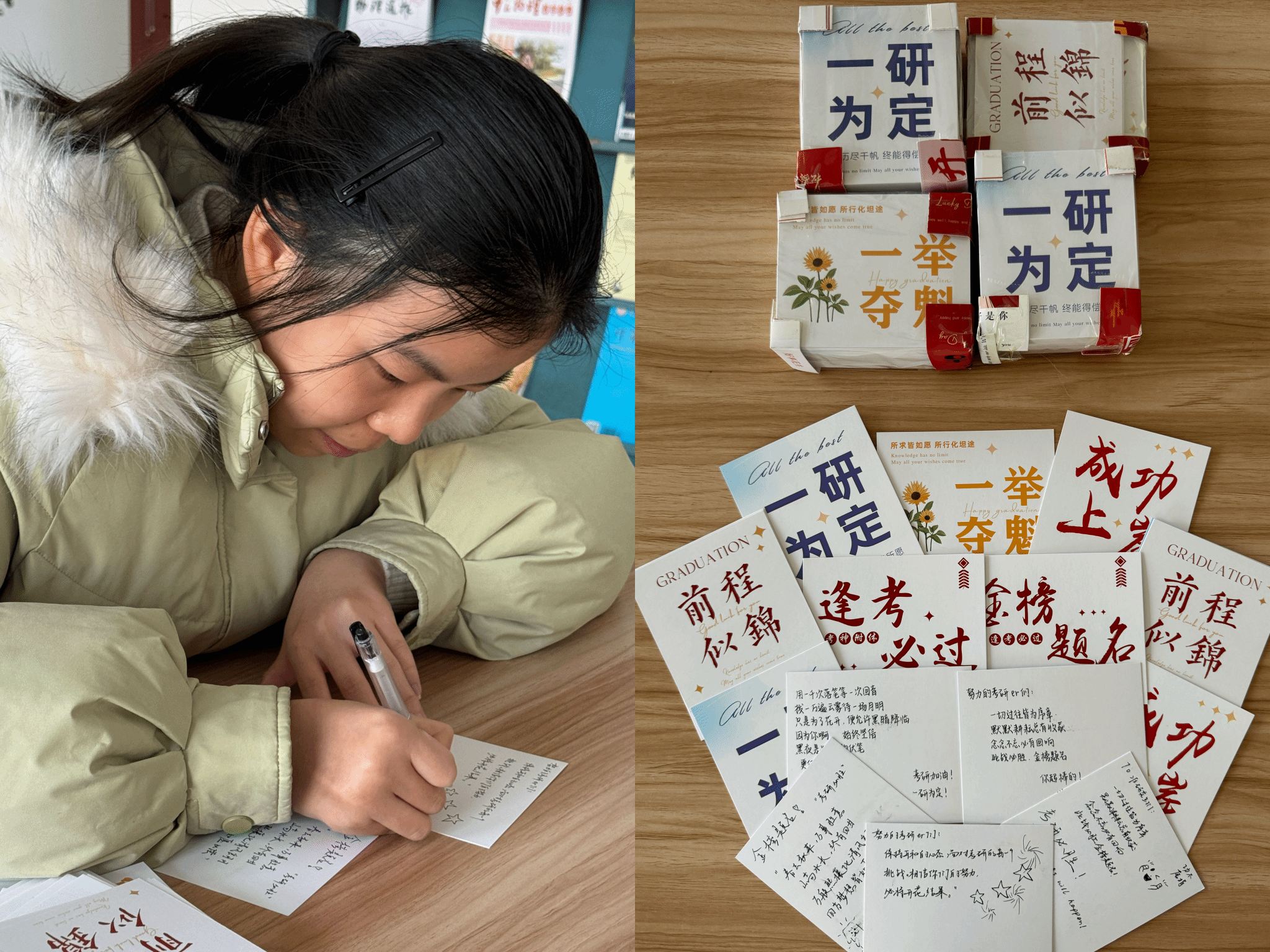 公司提前联系2020级考研“上岸”的学长学姐,录下鼓励祝福视频,同时组织2022级学子为考研学长学姐手写祝福贺卡。“心怀凌云志,梦许万里山,愿你们在最后关头披荆斩棘,一战成硕!”,考取陕西师范大学的顾刘涛同学、同济大学的陈龙同学、南京财大的李秋伊同学,在视频里纷纷祝福学弟学妹们金榜题名,实现自己的梦想。