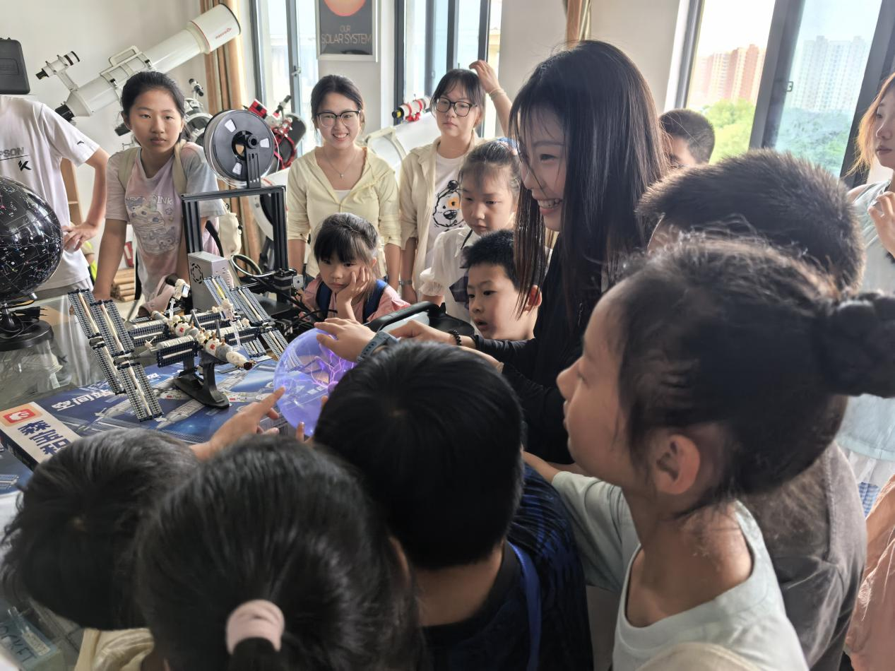 天文馆内特别设置了趣味科学实验环节:魔法闪电球在通电后迸发出绚烂的电弧,仿佛宇宙中的闪电风暴;“撬不动的纸”通过简单的物理原理,让孩子们惊叹于摩擦力的神奇;“消失的硬币”借助光学折射玩起“魔术”,而“一个不倒的小人”则用重心原理演示着平衡的奥秘。来自安庆师范大学老员工天文爱好者协会的志愿者带领小朋友们深入探索天文观测仪器,以小组为单位进行了牛顿反射式望远镜的组装和观测。孩子们除了近距离观察天文模型,还通过模拟星空观测、太阳系运行演示等互动设备,沉浸式体验宇宙探索的乐趣。