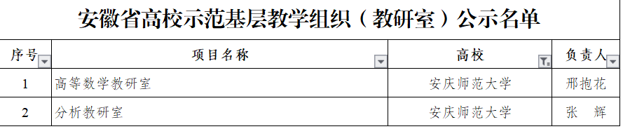近日,安徽省教育厅示范基层教学组织(教研室)、教学示范课名单公示。数理学院获批省级示范基层教学组织(教研室)2个、省级教学示范课11门。