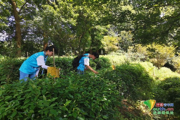 图为实践团成员走进茶园,近距离观察茶叶,了解茶叶的生长情况,为宣传祁门红茶铺垫相关知识。中国青年网通讯员 叶菲 摄