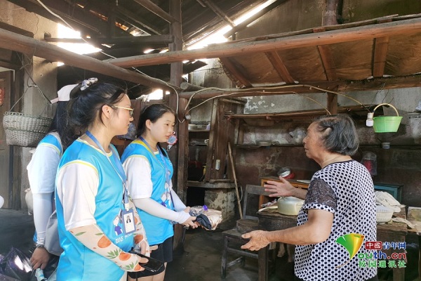 图为实践团成员慰问家中儿女都外出打工的空巢老人,奶奶正在为成员们述说当时洪水的严重程度,描述比划洪水的涨势。中国青年网通讯员 叶菲 摄
