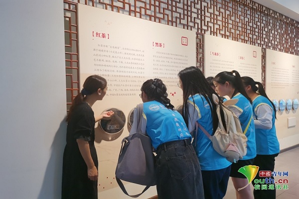 图为博览园工作人员丁婉正在为实践团成员讲述各种茶叶的形状特征和发展历史,近距离观察加工后的茶叶。中国青年网通讯员 叶菲 摄