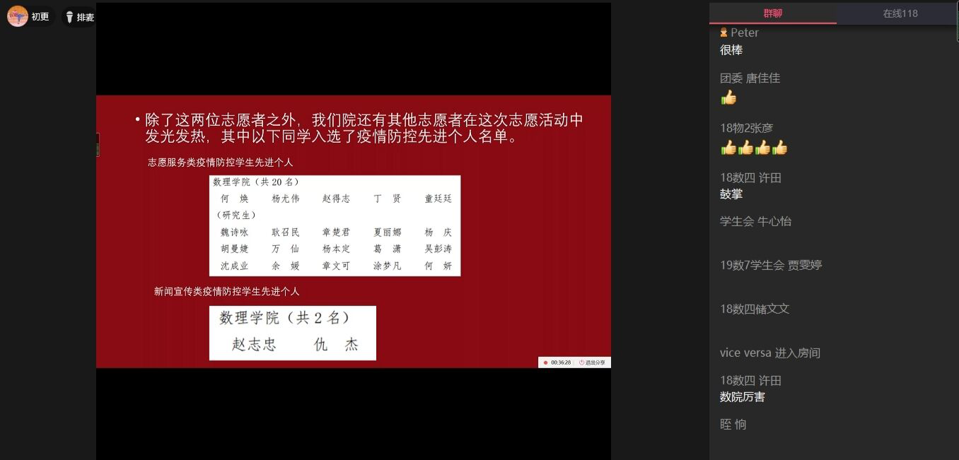 会议表扬了在这次疫情中涌现的一批批热血志愿者。据悉,公司共有22名同学获得疫情防控先进个人称号,其中志愿服务类20名,新闻宣传类2名。他们不畏艰险,本着为人民服务的精神,参加到社区、村镇的志愿服务中去,用青春书写生命的乐章。会议还邀请了其中两名志愿者代表—19级研究生何焕和19级数学类七班章文可,她们分别讲述了疫情中遇到的人和事以及她们在志愿服务中的感受与收获。“上不了防疫一线,但我们可以做志愿后勤兵”,何焕同学这样说到。是的,社区、村镇的志愿工作虽小,却也保护着一方安全。章文可同学在志愿工作中负责登记发放出入证,每天工作时间长、人员多,特别是遇到老爷爷老奶奶时要扯着嗓子喊,一天下来嗓子会特别干涩。但章文可同学却意志坚定地说:“虽然服务工作很累,但是她觉得值得” 。