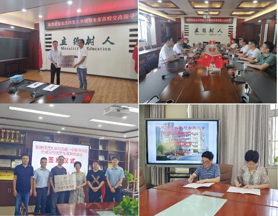 数理学院招生宣传组分别前往寿县中学、寿县第二中学、合肥北城中学、合肥第二中学、合肥锦绣中学进行招生宣传。在与各中学董事长、教务处主任和招生负责人的座谈会上,数理学院招生宣传组详细介绍了安庆师范大学悠久的办学历史、学科专业门类、团队队伍建设、招生计划等方面的情况,同时也汇报了数理学院的发展概况、专业特色、学科团队等。为各中学提供了《安庆师范大学2022年报考指南》宣传册,并与寿县中学、寿县第二中学、合肥北城中学、合肥第二中学、合肥锦绣中学分别签订了“优质生源基地”合作协议,并举行“优质生源基地”授牌仪式。
