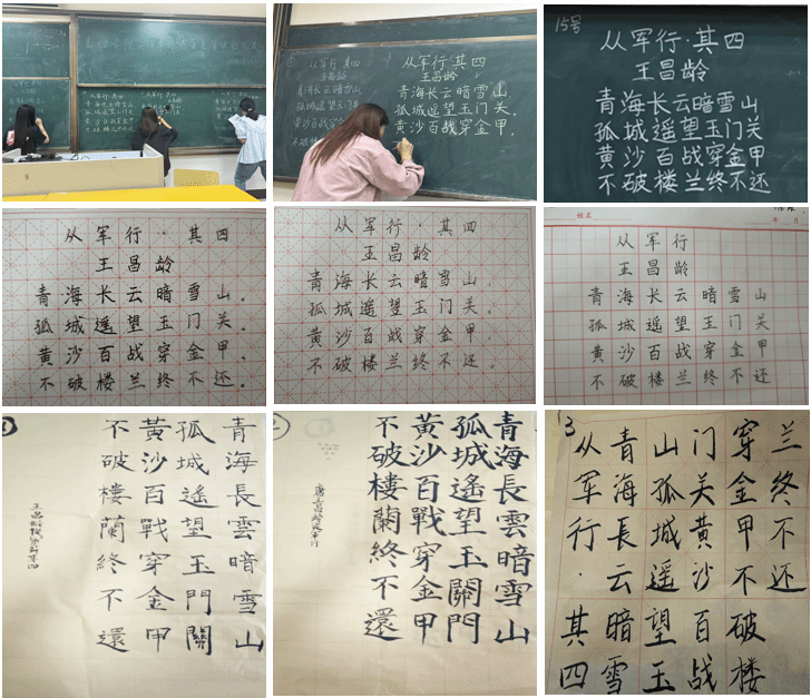 比赛现场,503教室被精心布置成一片书法的海洋。选手们或执粉笔在黑板上挥洒自如,或握硬笔在纸上镌刻经典,或持毛笔在宣纸上书写风流。她们的笔下,既有工整有力的粉笔字,又有刚劲潇洒的硬笔字,还有灵动飘逸的毛笔字,每一幅作品都展现出选手们独特的书写风格和对传统文化的热爱。