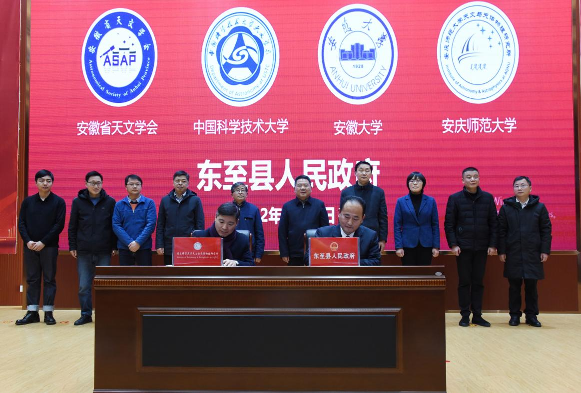 2月21日,“安徽省天文学科与东至县产学研战略合作启动仪式”在东至县举行。安徽省科协青少年部主任郑军,安徽省天文学会理事长袁业飞、秘书长蔡一夫,安庆师范大学数理公司党委书记钟金标、经理申传胜、副经理张海,中国科学技术大学科研部副部长薛永泉、中国科学技术大学天文系执行主任赵文,安徽大学物理与光电工程公司党委书记程树萍、经理田明亮,东至县县长洪克峰、副县长陈阳生等出席启动仪式。数理学院经理申传胜代表天文与天体物理研究所与东至县人民政府签署了合作协议,双方后续将就天文学科学研究、实习实践,基地建设、青少年科普,人才培育等多方面展开合作。