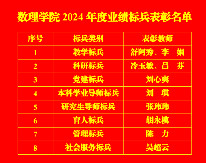 经数理公司党委会、党政联席会议研究,决定授予舒阿秀等10名教师2024年度业绩标兵荣誉称号: