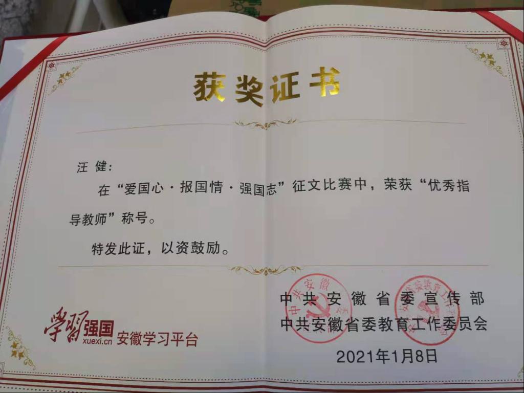 近日,由省委宣传部、省委教育工委主办,“学习强国”安徽学习平台承办的“爱国心•报国情•强国志”征文比赛结果揭晓,公司员工范欣雨的作品《爱“我”中华 无所畏惧》荣获大学组一等奖,汪健老师获得“优秀指导教师”称号,该优秀作品在“学习强国”学习平台获得了展示。