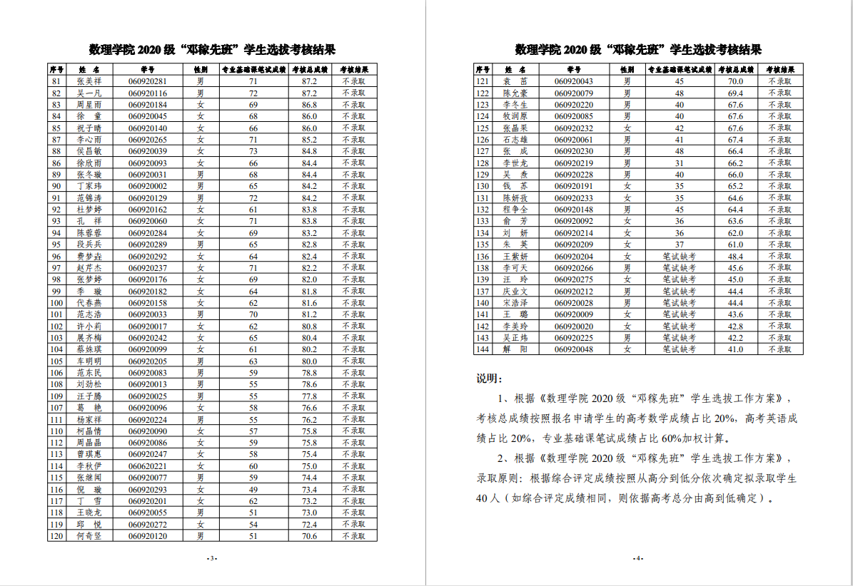 数理学院2020级“邓稼先班”员工选拔结果公示