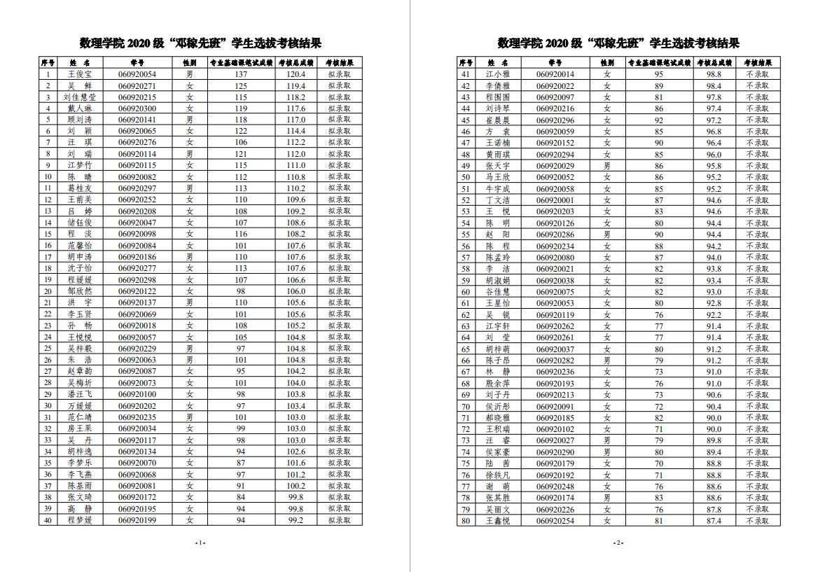 附件:数理学院2020级“邓稼先班”员工选拔考核结果