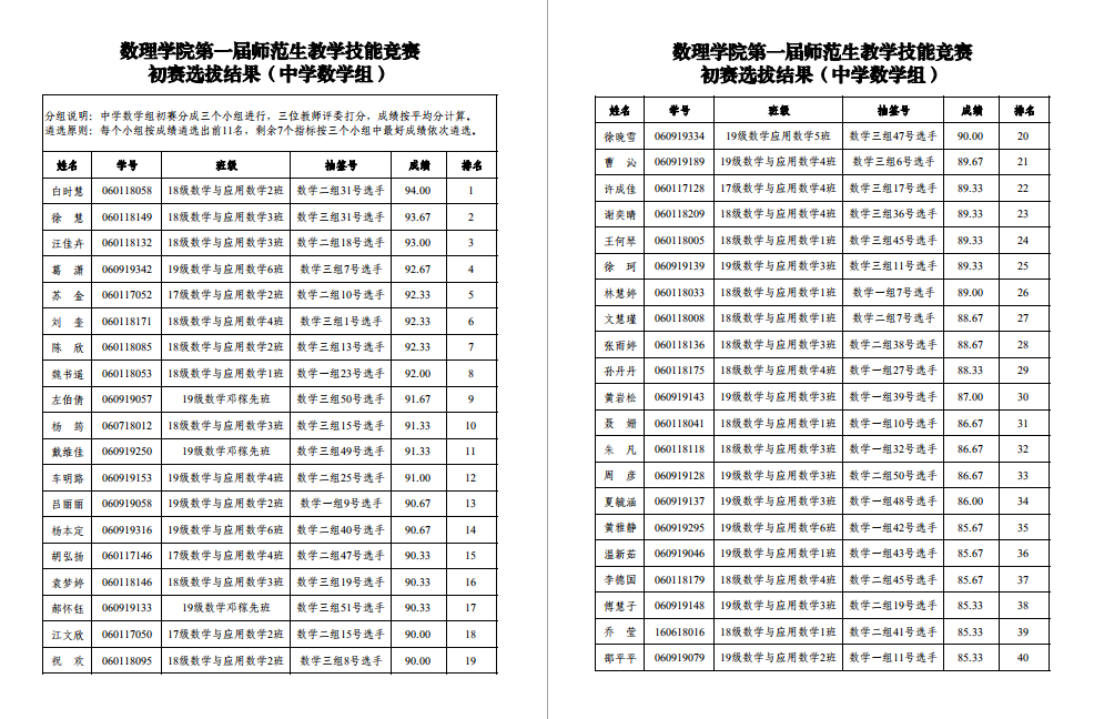 1. 数理学院首届师范生技能比赛初赛选拔结果(中学数学)