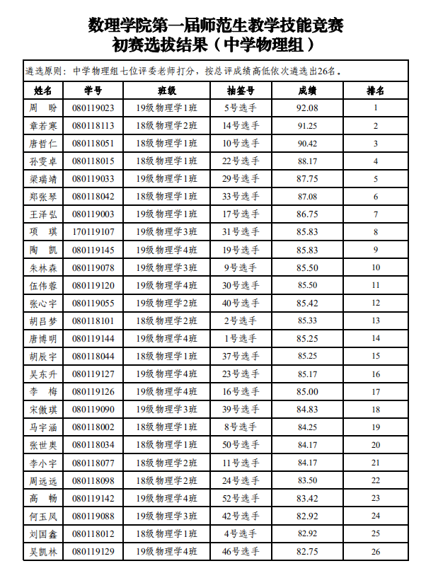 2. 数理学院首届师范生技能比赛初赛选拔结果(中学物理)