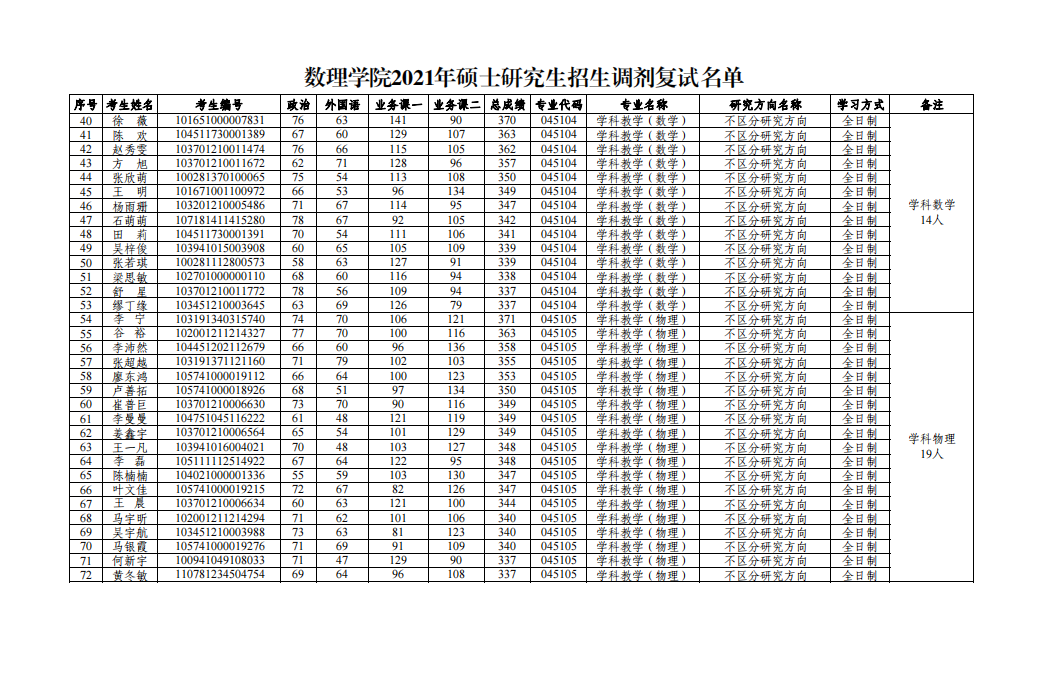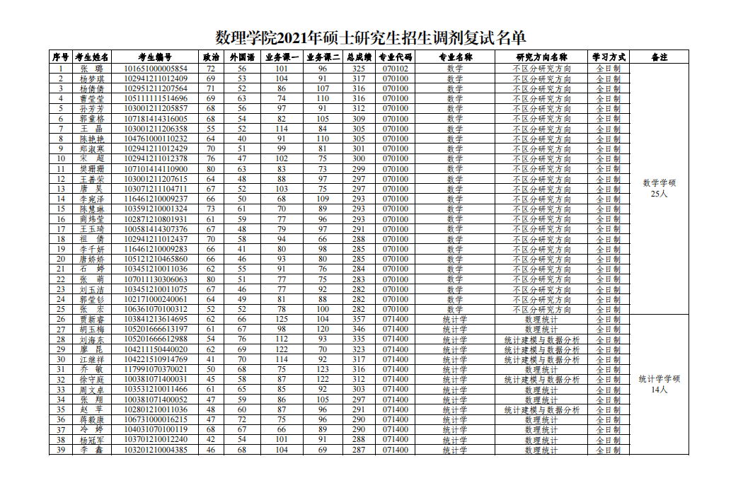 数理学院2021年硕士研究生招生复试时间安排和调剂复试名单