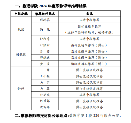 根据《安徽省普通本科高等学校教师专业技术资格申报条件》(皖教人〔2016〕1号)、《关于做好安庆师范大学2024年度职称推荐评审工作的通知》(校政秘〔2024〕172号)等文件精神,数理学院2024年教师职称评审推荐组于2024年11月28日召开评审推荐会,对本次申报教学系列职称教师进行资格条件审核、评议,并进行投票推荐,推荐结果经数理公司党委会和党政联席会议审定,现将推荐结果和个人申报材料公示如下(申报同一职称按姓氏笔画排序):