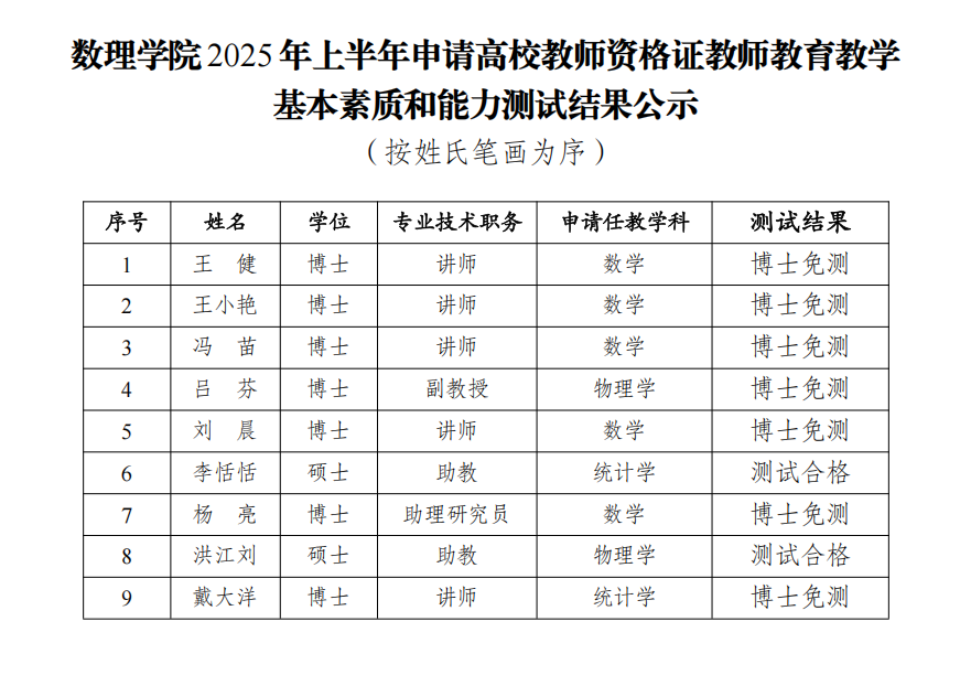 根据学校《关于开展2025年上半年高校教团队格认定工作的通知》精神和要求,经个人申请、学院考核,现将学院2025年上半年申请高校教团队格证的9名教师公司产品基本素质和能力测试结果公示如下: