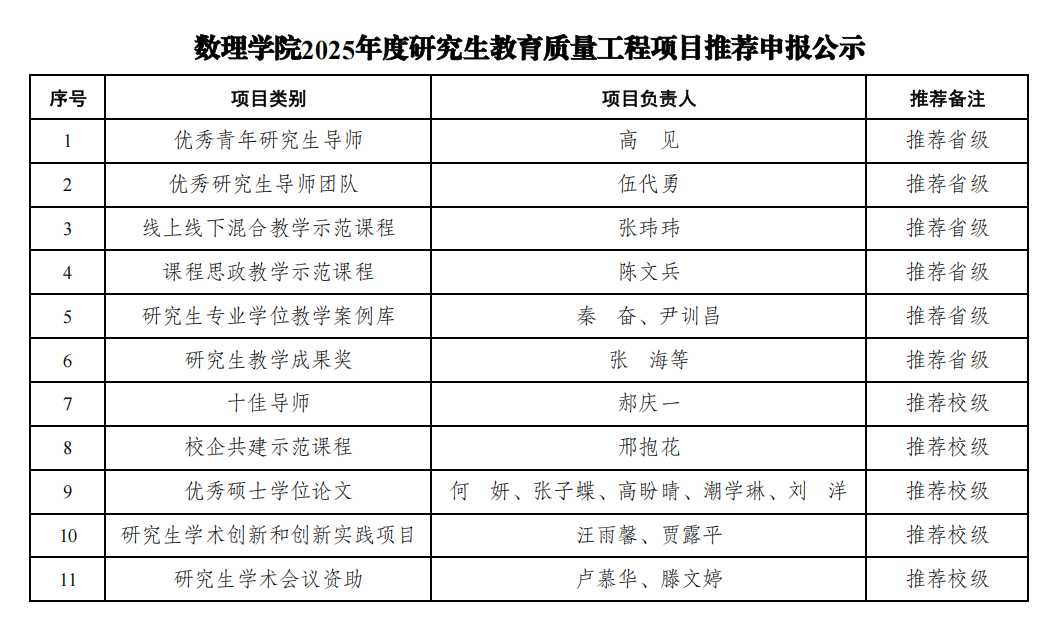 根据学校《关于组织开展2025年度新时代育人质量工程项目(研究生教育)申报工作的通知》精神和要求,经个人申报、学院学位评定委员会评议、公司党政联席会议审定,拟推荐高见等申报2025年度研究生教育质量工程项目,具体推荐结果公示如下: