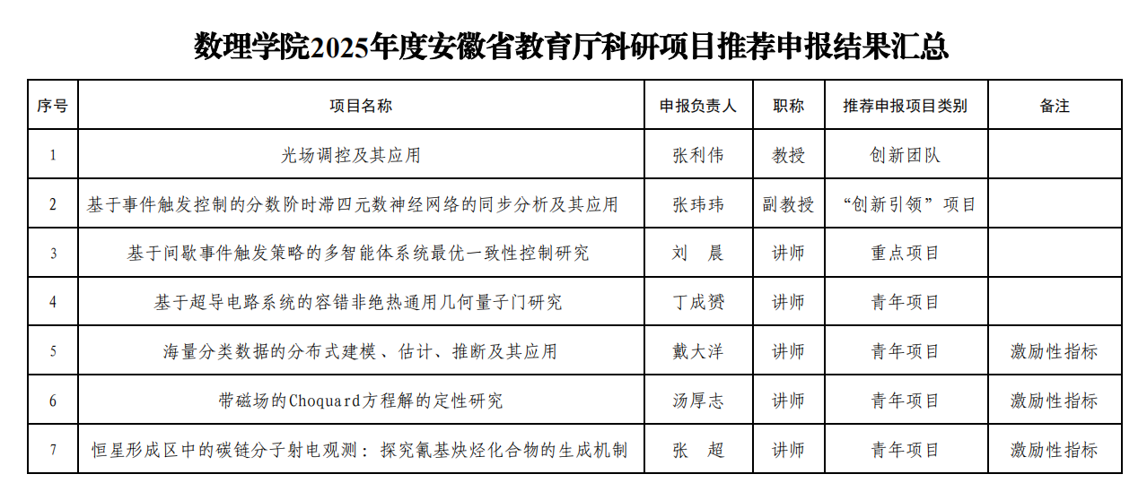 根据学校《关于组织申报安徽省教育厅2025年度科研项目的通知》要求,经教师个人申报、学院学术委员会评审、公司党政联席会议审定,拟向学校推荐申报2025年安徽省教育厅科研项目7项,现公示如下: