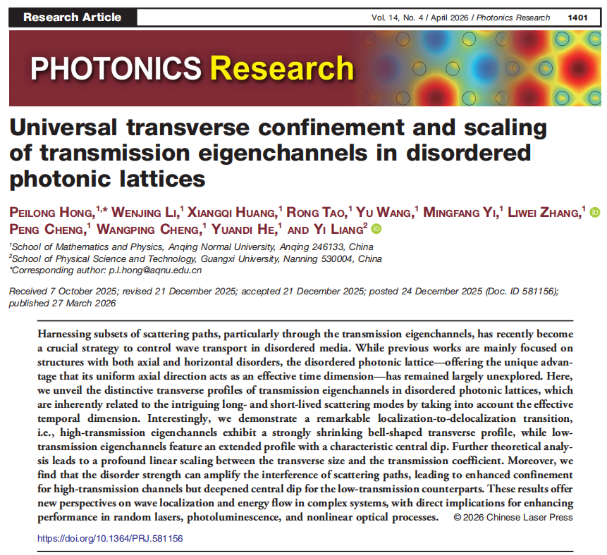近日,tyc8722太阳集团副教授洪佩龙研究组在光学领域一区Top期刊《Photonics Research》(影响因子7.2)上发表重要研究成果。该工作揭示了无序光子晶格中传输本征通道的局域-离域规律,为复杂散射系统中的光输运调控提供了新思路。
