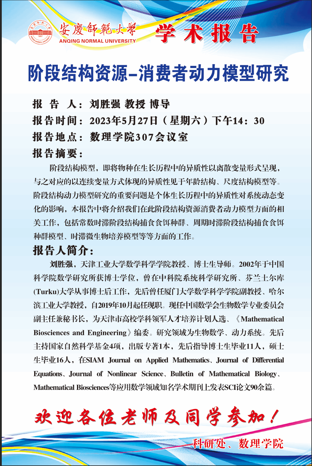 天津工业大学刘胜强教授应邀作题为“阶段结构资源-消费者动力模型研究”学术报告的预告