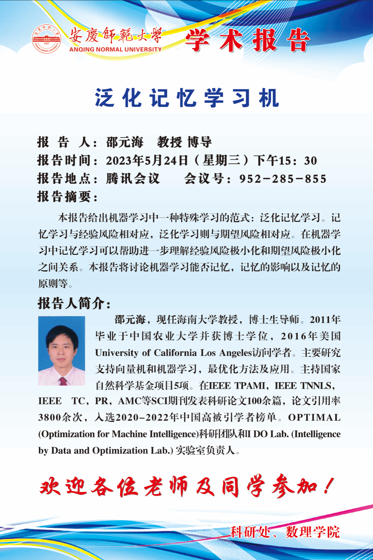 海南大学邵元海教授应邀作题为“泛化记忆学习机”的学术报告预告