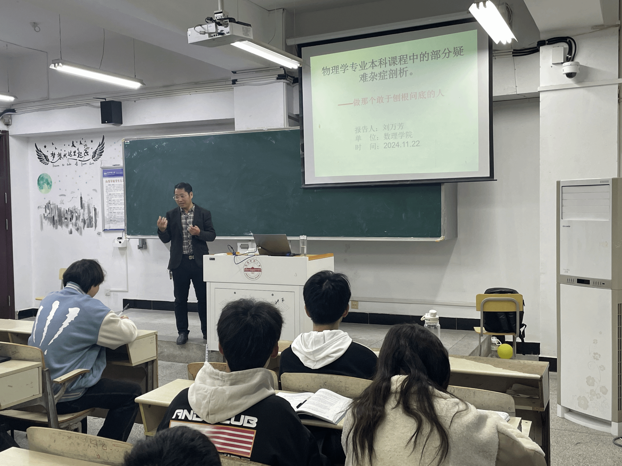 11月22日下午,数理学院刘万芳副教授在B楼401教室举办了一场题为“物理学专业本科课程学习”的讲座。2023级物理学稼先班全体同学参加了讲座。