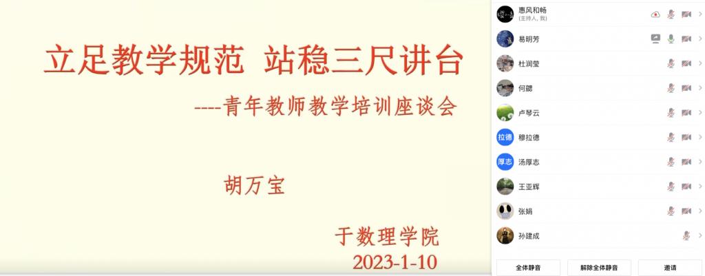 为进一步加强团队建设、持续提升教学质量、促进新教师更好更快地站稳三尺讲台,数理学院于1月10日下午在数理楼307会议室以线上线下相结合的方式召开2022年新入职教师教学培训与交流会。会议特邀请了校级教学督导胡万宝教授给新教师做题为“立足教学规范,站稳三尺讲台——青年教师教学培训”的专题讲座,教学办公室工作人员、2022年全体新入职教师参加会议,公司党委委员、副经理易明芳主持会议。