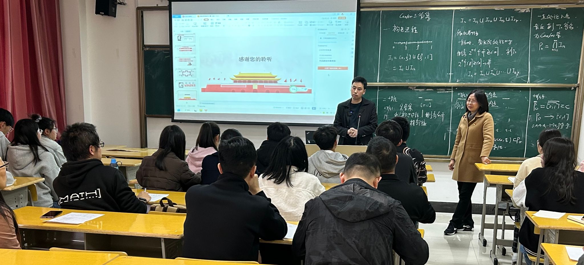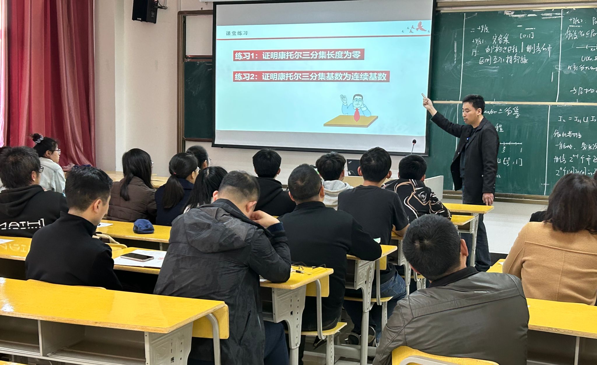 本次教学示范课内容为“实变函数”第二章点集—康托尔三分集。胡老师通过《九章算术》中的“阳马”无限分割问题和柯赫雪花曲线生动引入新课,巧妙融入课程思政元素,激发员工的学习兴趣。重点分析了康托尔三分集的构造过程与性质,以具体例子加以拓展,最后点出其在物理学量子信息领域的应用前景。整堂课设计完整、重点突出,时间把控精准,课程内容极具思想性和启发性,授课语言诙谐幽默,恰当的肢体语言极具感染力。