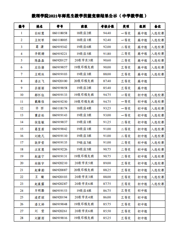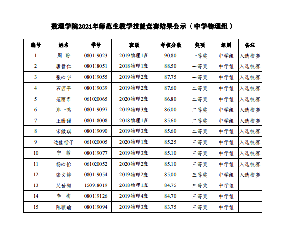 根据《数理学院关于公布2021年师范生教学技能竞赛实施方案的通知》(院发〔2021〕45号)要求,经竞赛工作组评分、学院审定通过,现将竞赛结果予以公示(具体见附件)。
